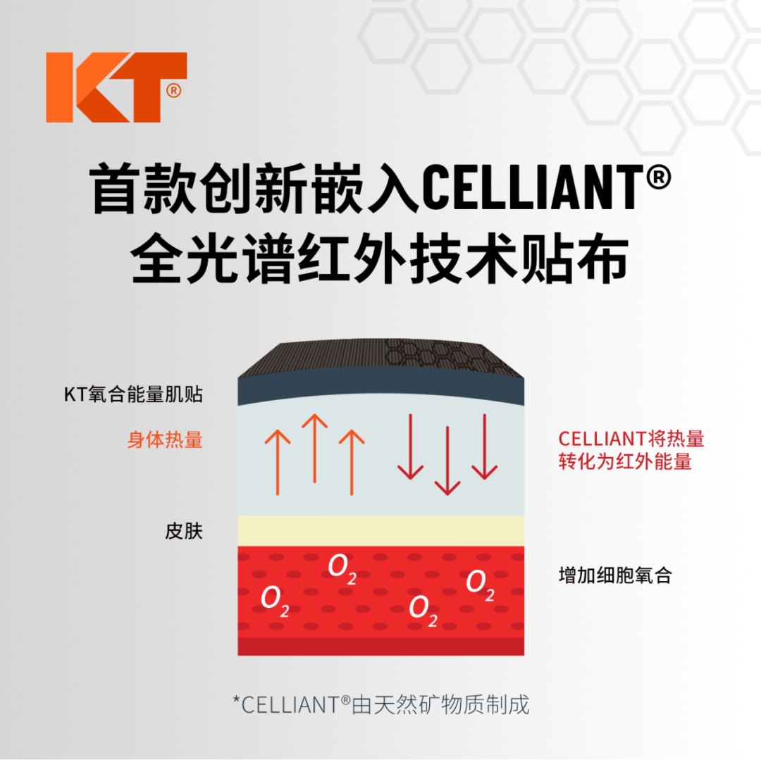 KT OXYGEN通过Celliant技术减少红外能量流失,用含有Celliant技术的贴布将其锁定,全光谱红外能量反射回身体,更容易被皮肤外侧的组织和肌肉更多的吸收。